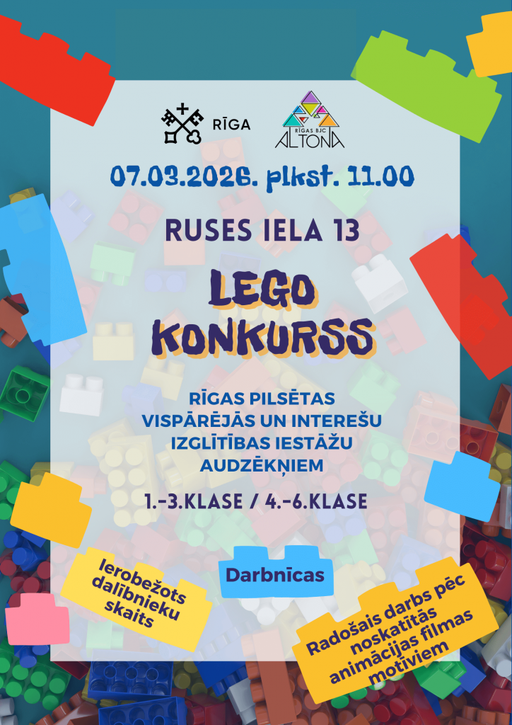 Rīgas Bērnu un jauniešu centrs “Altona” sadarbībā ar Rīgas valstspilsētas pašvaldību aicina Rīgas vispārējās un interešu izglītības iestāžu audzēkņus piedalīties LEGO konkursā.