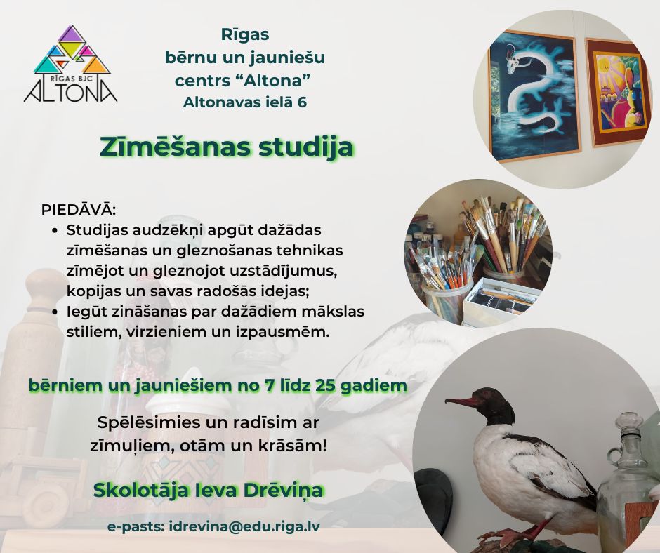 PULCIŅI Altonavas ielā 6 TĀLRUNIS SAZIŅAI 67612354 3d dizaina pasaule Aksesuāru pasaule Angļu valodas klubs animācijas pasaule attīstošā vingrošana baleta studija “Žizele” bungu spēle datorgrafikas pasaule datorzinību un robotikas studija digitālo tehnoloģiju mākslas studija dizaina studija “Nāc un radi” Ģitārspēle (A.Pelčers) Ģitārspēle (U.Kronbergs) Interjera dizaina studija “Jauno mūziķu studija” klavierspēle Jauno rakstnieku un žurnālistu klubiņš keramikas studija kompozīcijas studija latviešu valodas klubs “Domā, runā, spēlē” lego klubs Meiteņu klubs “Mežrozīte” modes lietu darbnīca mūsdienu deju studija “festa” netradicionālo mākslas tehniku studija Papīra māksla. Dizains. Populārās mūzikas ansamblis Ritmika sarīkojumu un balles deju studija stikla dizaina studija tautas dejas teātra REVEDO studija tekstilmākslas un filcēšanas studija “Vijumiņš” tēlniecības studija vokālā studija vokālā studija “Mārītes” zīmēšanas studija (A.Tiltiņa) zīmēšanas studija (I.Drēviņa) zīmēšanas un gleznošanas studija zvanu ansamblis